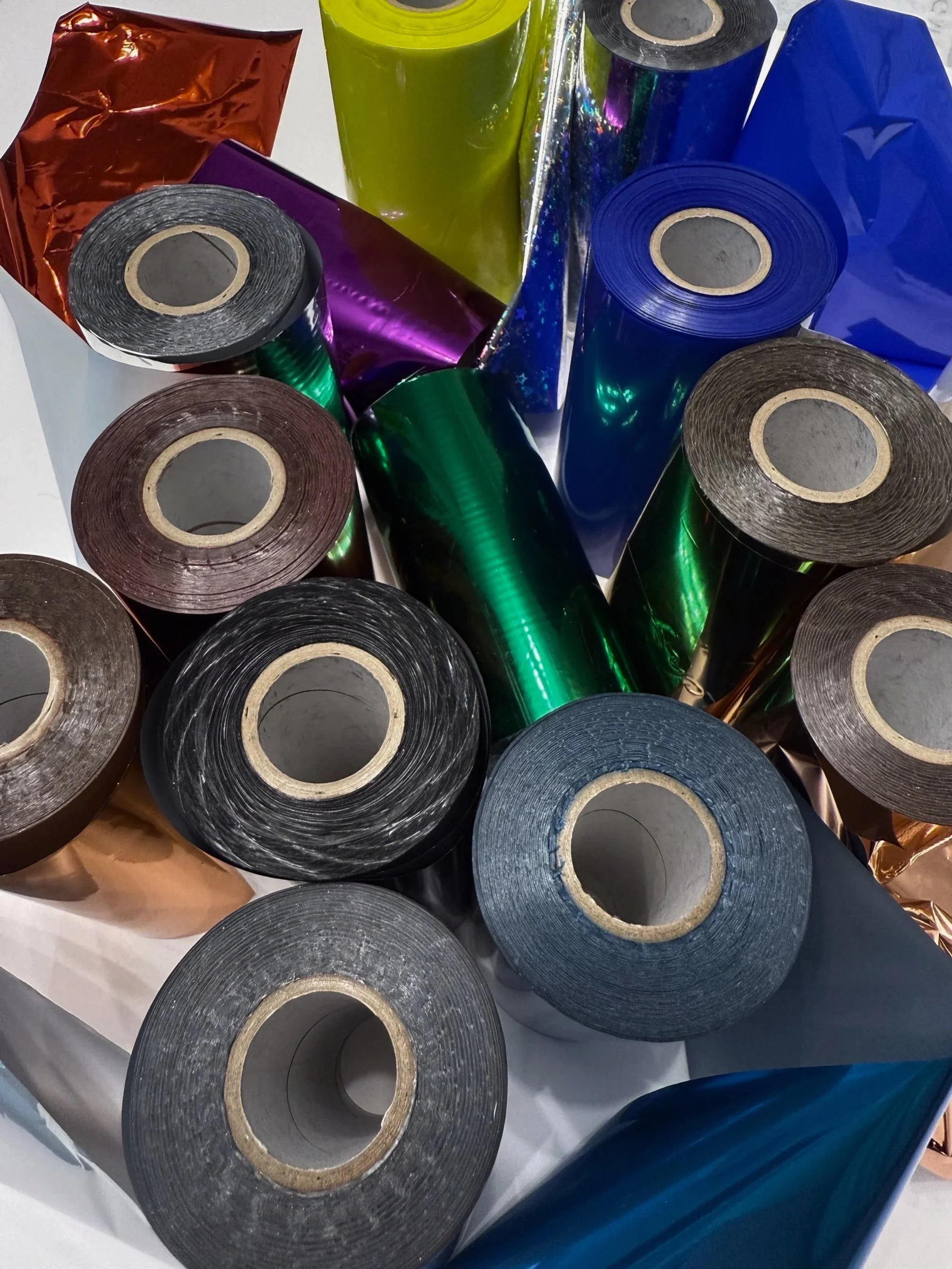 From there, you choose your foil. There’s more than just gold and silver — foil comes in a wide range of shades, from soft matte finishes to gleaming metallics and even holographic options. The chosen foil is carefully aligned between the die and the paper, then pressed together on a hot foil machine. The combination of heat and pressure causes the foil to bond only where the raised design touches the paper, creating a crisp, shiny impression.
